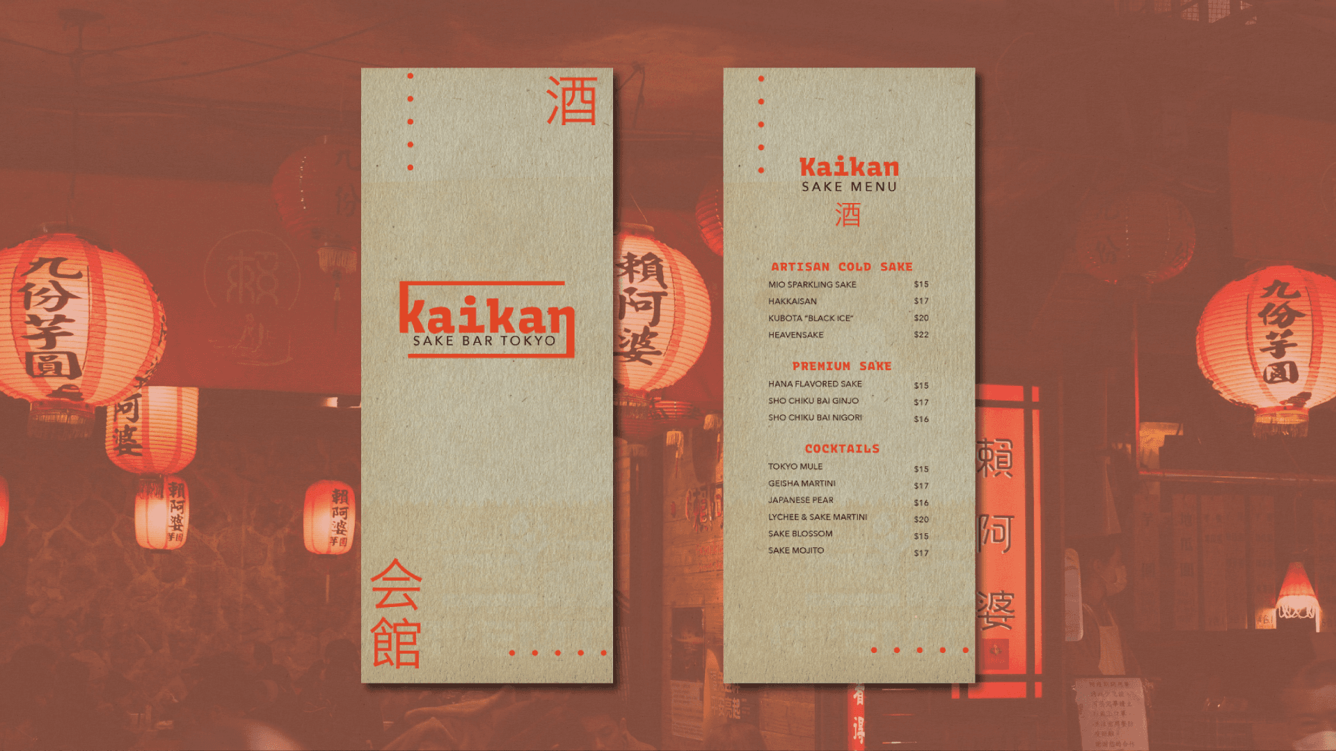 The final identity blends traditional Japanese influences with a modern design approach. Traditional aesthetics were used to create a brand that feels both timeless and current. The result is an inviting visual system that supports Kaikan’s atmosphere as a stylish yet approachable sake bar, balancing heritage with contemporary design.