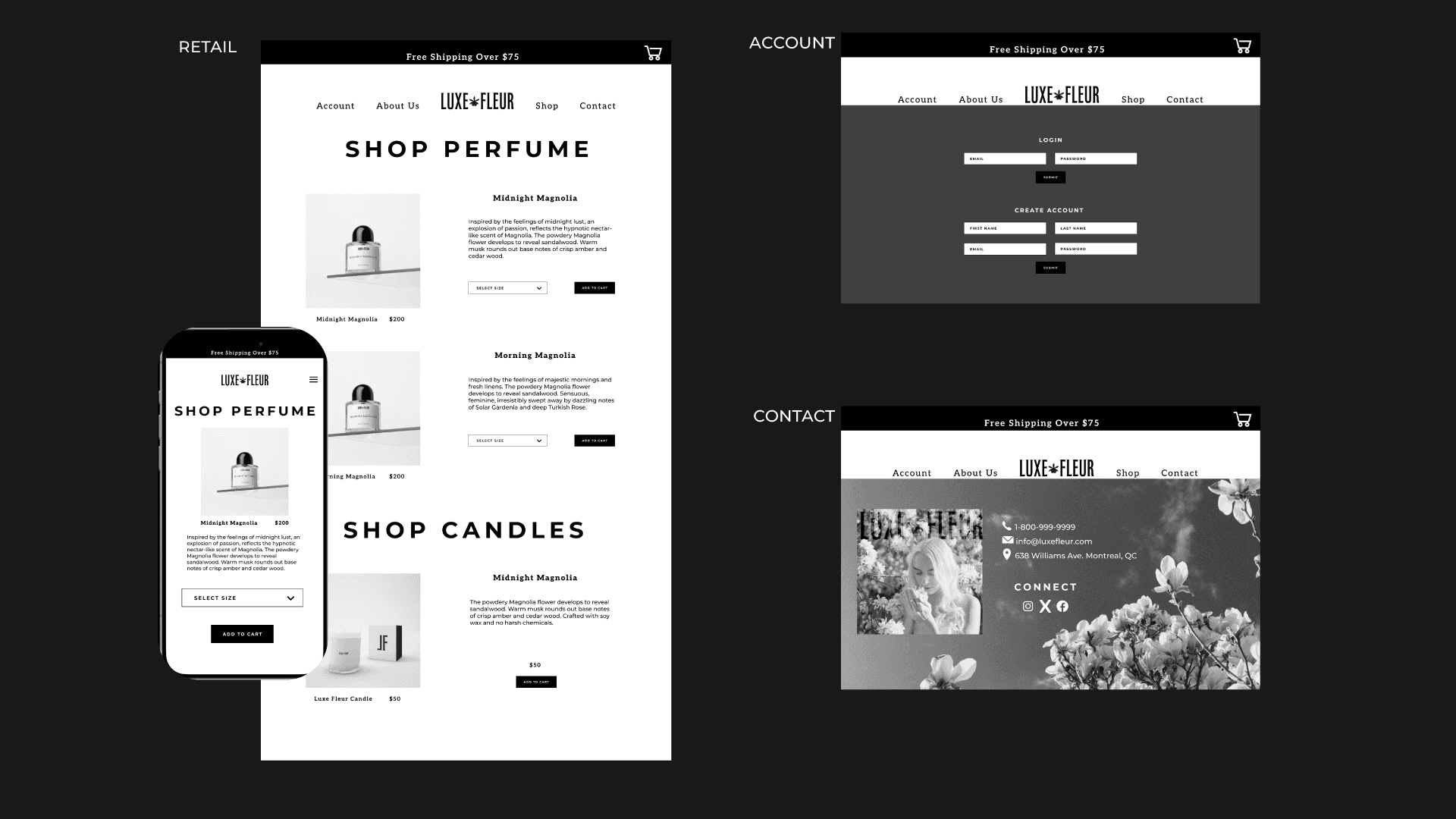 The final web design uses a high-contrast black and white colour palette to reinforce Luxe Fleur’s luxury positioning while enhancing clarity and visual impact. A typography system pairing Montserrat and Aleo creates contrast and hierarchy, supporting both elegance and readability across the interface.