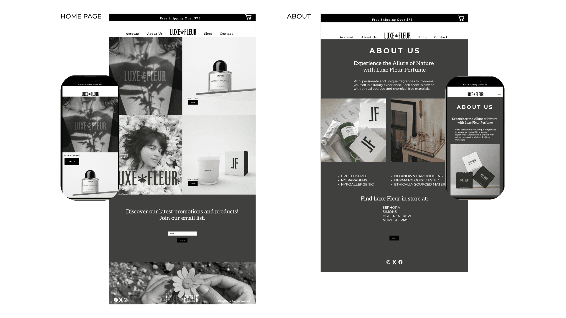 Luxe Fleur is a mock boutique perfume brand developed to explore luxury-focused web design through a user centered approach. The objective of this project was to create a digital experience that reflects the brand’s minimalist and refined aesthetic while prioritizing clarity, usability, and emotional engagement. The design balances sophistication with simplicity, ensuring the interface feels elevated yet intuitive.